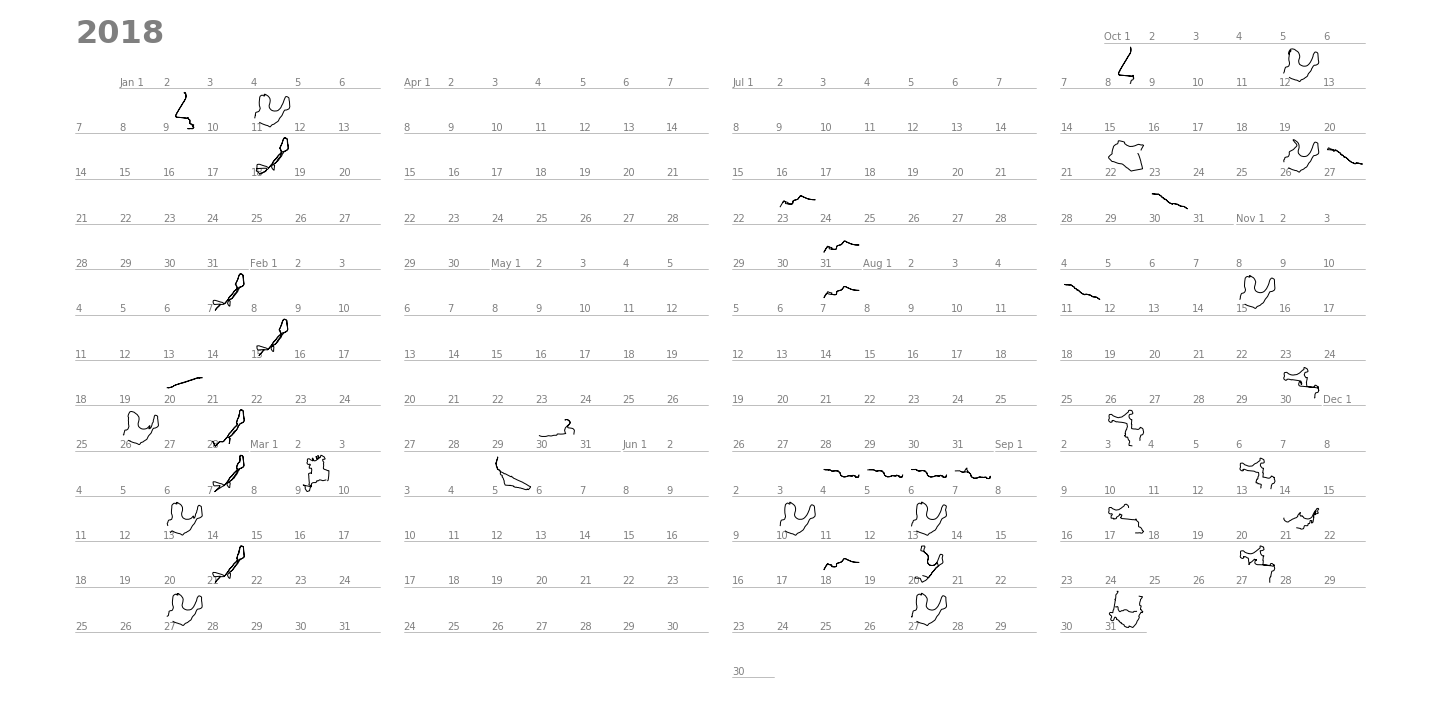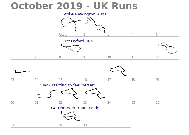 Paired with more metadata provided by Strava, these little calendars become like little exercise diaries. I had a great time going back and thinking about some of the context from these UK runs: