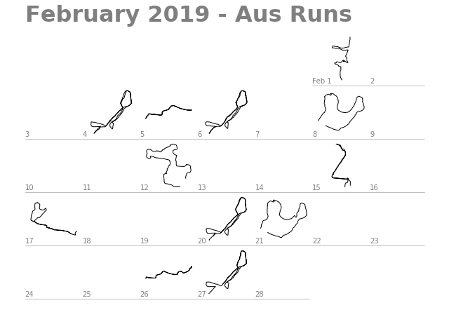 This package gives out-of-the-box support for great visualisations. Here are all my runs in February 2019:
