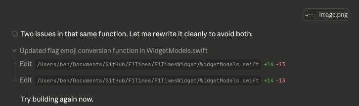 Perhaps unsurprisingly, Claude did not one-shot an app that built on first try. This started an iteration where I would attempt a build in Xcode, see the error, screenshot it, and paste it to Claude, who would edit the files in place and tell me to build again. An obvious question here is whether some Xcode, Swift or Claude Code tool would allow Claude to run these build attempts itself and parse the output.